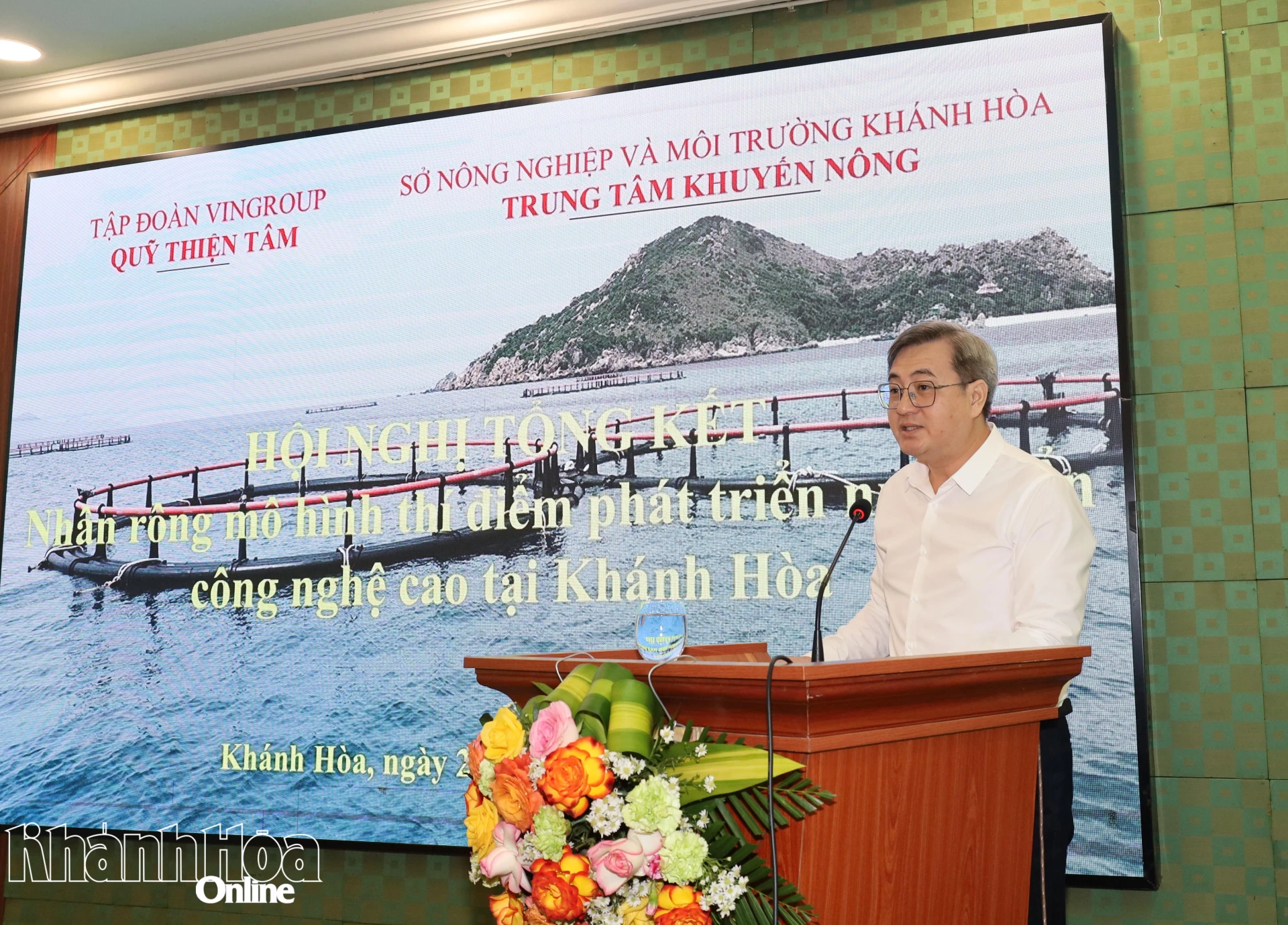 Phát biểu tại hội nghị, ông Võ Văn Công – Phó Giám đốc Sở Nông nghiệp và Môi trường đánh giá cao sự đồng hành, hỗ trợ của Quỹ Thiện Tâm, Tập đoàn Vingroup trong việc đầu tư cơ sở vật chất, chuyển giao khoa học kỹ thuật cho người dân. Đồng thời nhấn mạnh, mô hình nuôi biển công nghệ cao không chỉ mang lại hiệu quả kinh tế mà còn góp phần thay đổi tư duy sản xuất của ngư dân, hướng đến sản xuất hàng hóa quy mô lớn, gắn với chuỗi giá trị từ nuôi trồng đến tiêu thụ sản phẩm. Ngành Nông nghiệp tỉnh cam kết tiếp tục phối hợp chặt chẽ với các đơn vị liên quan để nhân rộng mô hình trong thời gian tới; tạo điều kiện cho người dân tiếp cận nguồn vốn, kỹ thuật và hỗ trợ kết nối thị trường, xây dựng thương hiệu sản phẩm thủy sản nuôi biển của địa phương.