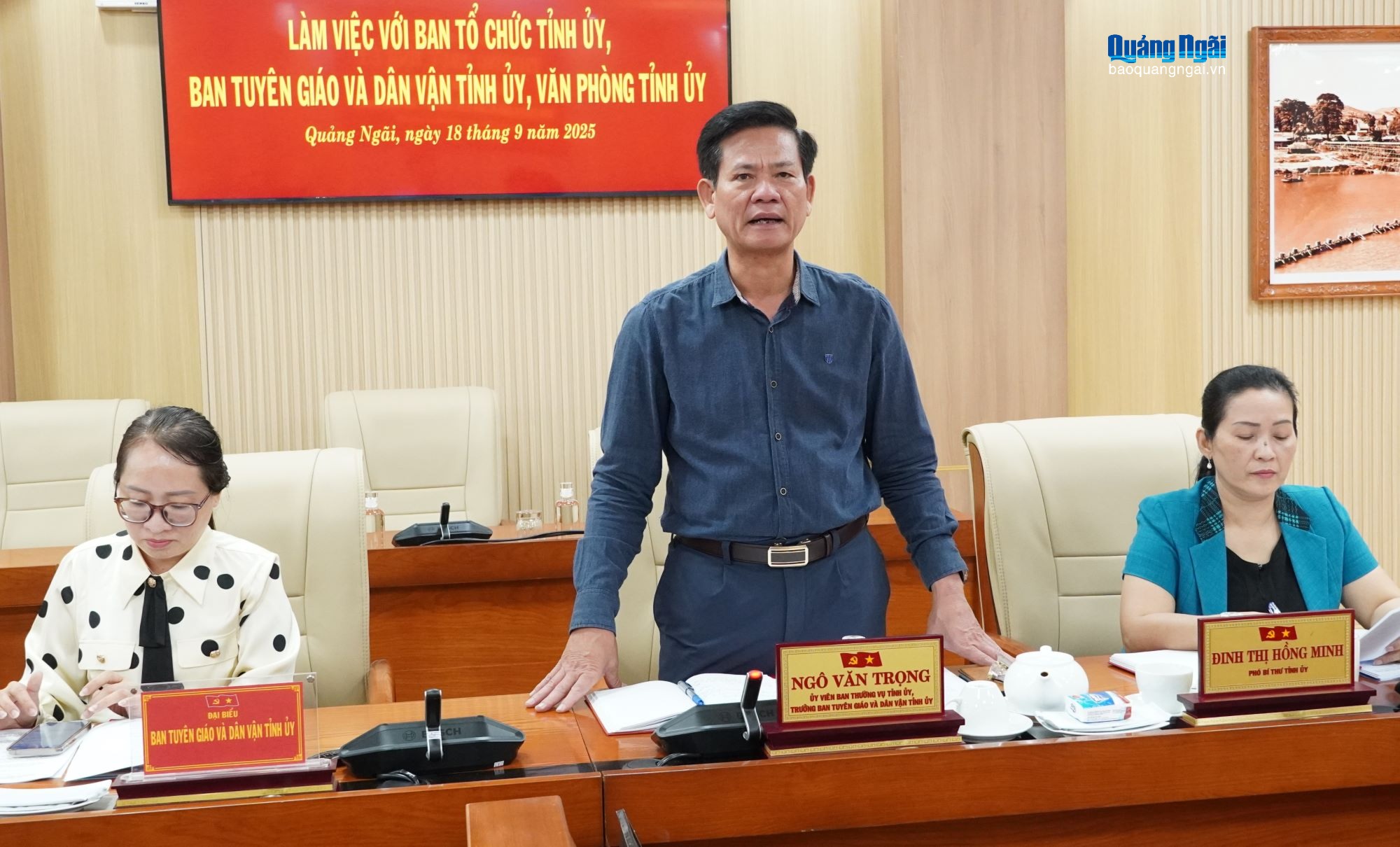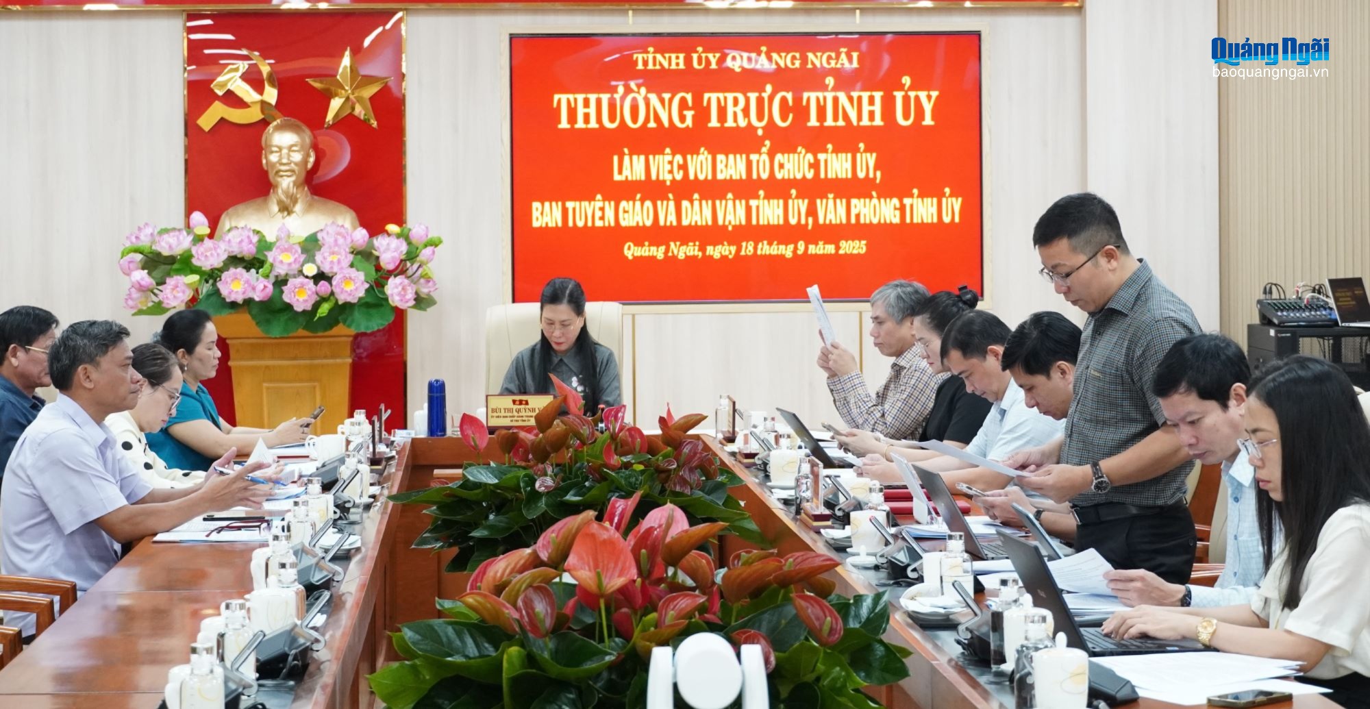 Sáng 18/9, Ủy viên Trung ương Đảng, Bí thư Tỉnh ủy Bùi Thị Quỳnh Vân chủ trì buổi làm việc giữa Thường trực Tỉnh ủy với Ban Tổ chức Tỉnh ủy, Ban Tuyên giáo và Dân vận Tỉnh ủy và Văn phòng Tỉnh ủy để cho ý kiến về Kế hoạch triển khai thực hiện Nghị quyết Đại hội đại biểu Đảng bộ tỉnh lần thứ I, nhiệm kỳ 2025 – 2030 và Chương trình hành động thực hiện Nghị quyết Đại hội.